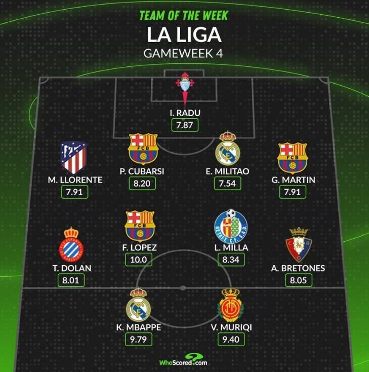 Whoscored评本轮西甲最佳阵:姆巴佩领衔,费尔明,米利唐在列 admin 2025年09月18日 05:30 64 0 直播吧9月16日讯 本轮西甲战罢,数据网站Whoscored也评出本轮西甲最佳阵,具体如下:门将:拉杜(塞尔塔)后卫:略伦特(马竞)、库巴西(巴萨)、米利唐(皇马)、马丁(巴萨)中场:多兰(西班牙人)、费尔明(巴萨)、米拉(赫塔费)、布雷通斯(奥萨苏纳)前锋:姆巴佩(皇马)、穆里奇(马洛卡) 标签: #西甲 #奥萨苏纳 #姆巴佩 #米利唐 #略伦特 #皇马 #布雷通斯 #西班牙人 #费尔明 #巴萨